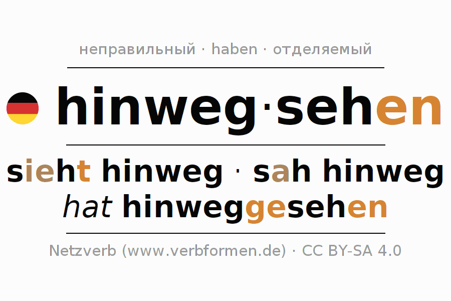 - Презенс: sieh (du) hinweg, seh(e)n wir hinweg, seht (ihr) hinweg, seh(e)n Sie hinweg