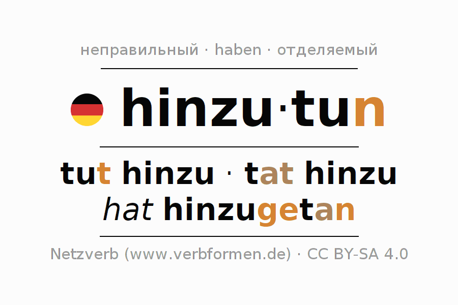 - Презенс: tu(e) (du) hinzu, tun wir hinzu, tut (ihr) hinzu, tun Sie hinzu