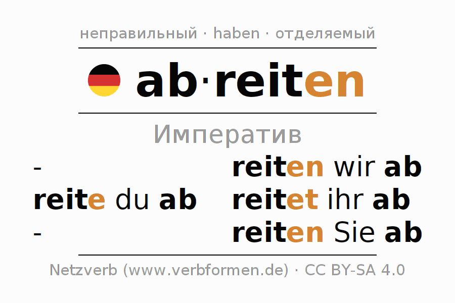 Формами спряжения abreiten (объезжать верхом, объехать верхом) в повелительном наклонении являются: reite (du) ab, reiten wir ab, reitet (ihr) ab, reiten Sie ab