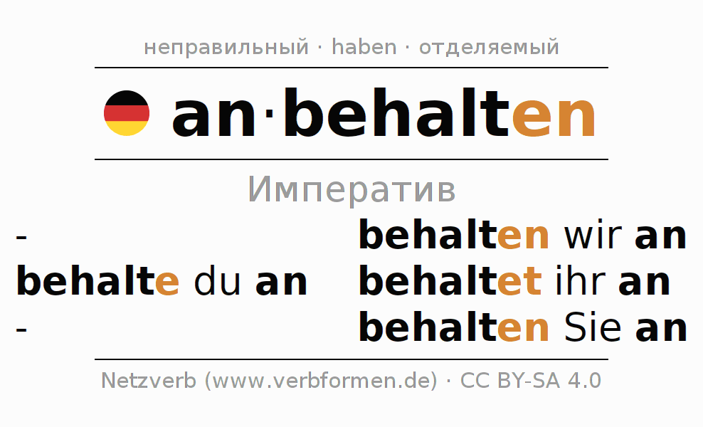 Формами спряжения anbehalten (не снимать, не снять) в повелительном наклонении являются: behalte (du) an, behalten wir an, behaltet (ihr) an, behalten Sie an