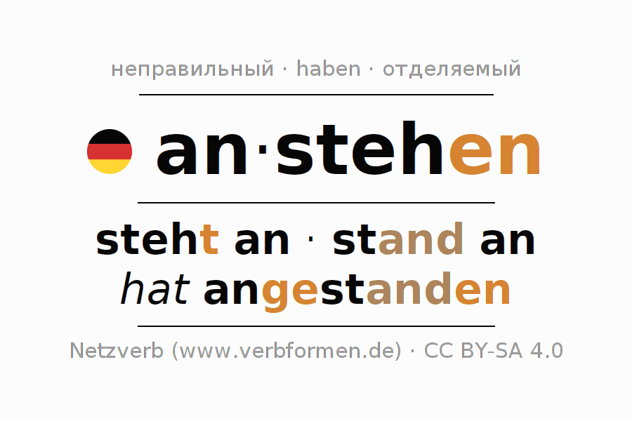 Формами спряжения anstehen (стоять в очереди, подходить) в повелительном наклонении являются: stehe (du) an, stehen wir an, steht (ihr) an, stehen Sie an