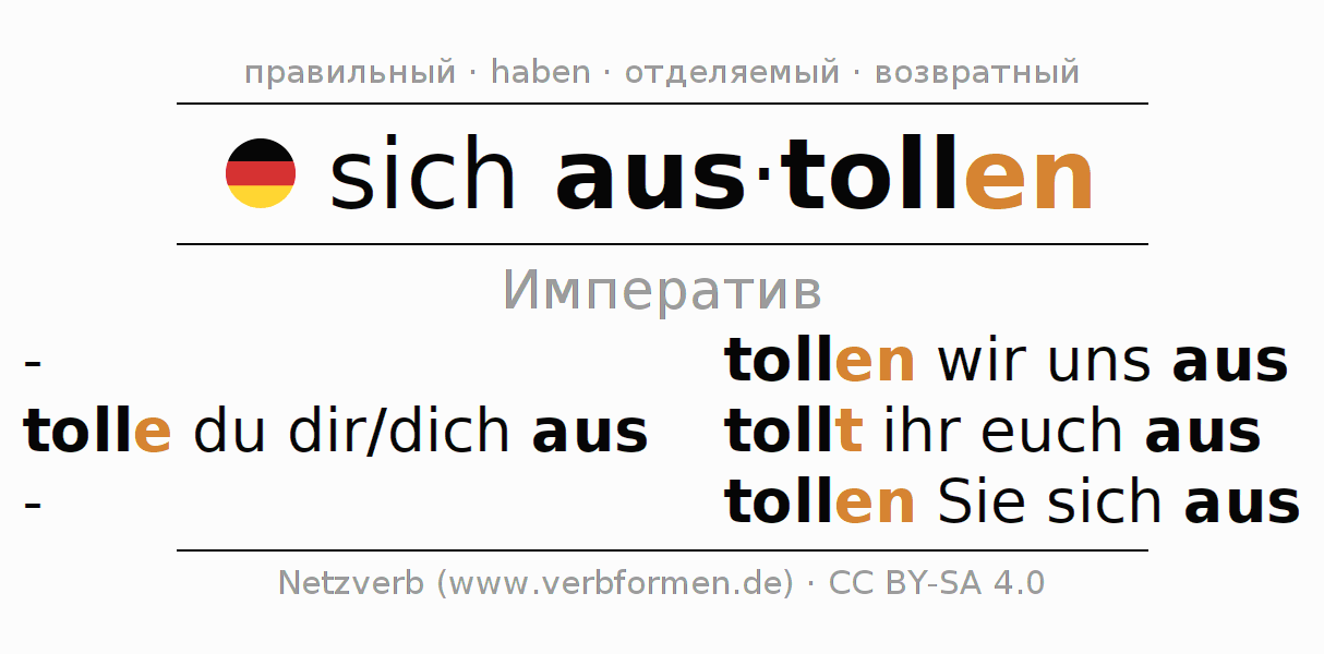 Формами спряжения sich austollen (бегать, беситься) в повелительном наклонении являются: tolle (du) dir/dich aus, tollen wir uns aus, tollt (ihr) euch aus, tollen Sie sich aus