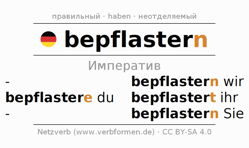 Этот глагол bepflastern полностью спрягается во всех лицах и числах Императив Презенс.