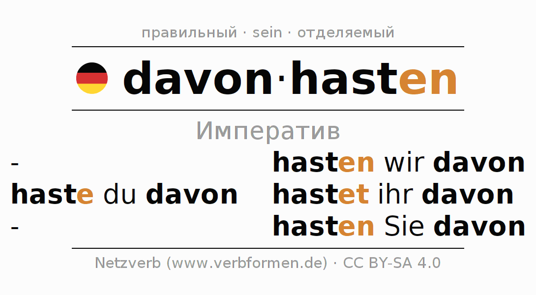 Формами спряжения davonhasten (поспешить, убежать) в повелительном наклонении являются: haste (du) davon, hasten wir davon, hastet (ihr) davon, hasten Sie davon