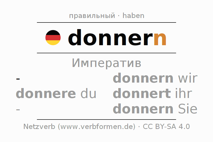 Формами спряжения donnern (греметь, громыхать) в повелительном наклонении являются: donn(e)re (du), donnern wir, donnert (ihr), donnern Sie