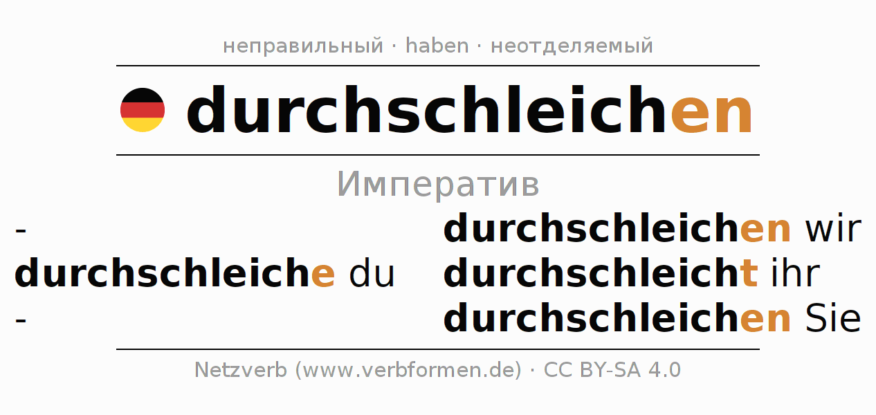 Этот глагол durchschleichen (hat) полностью спрягается во всех лицах и числах Императив Презенс.