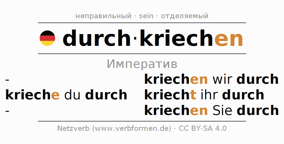 Формами спряжения durchkriechen (проползать, облазить) в повелительном наклонении являются: krieche (du) durch, kriechen wir durch, kriecht (ihr) durch, kriechen Sie durch