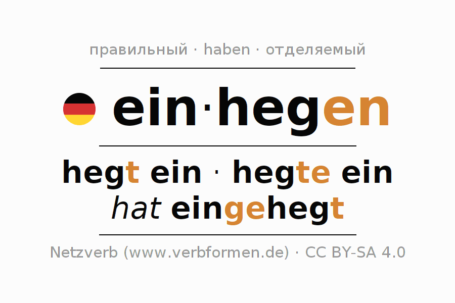 Формами спряжения einhegen (ограда, ограждать) в повелительном наклонении являются: hege (du) ein, hegen wir ein, hegt (ihr) ein, hegen Sie ein