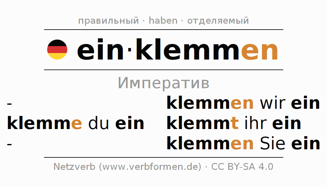 Формами спряжения einklemmen (защемить, защемлять) в повелительном наклонении являются: klemme (du) ein, klemmen wir ein, klemmt (ihr) ein, klemmen Sie ein