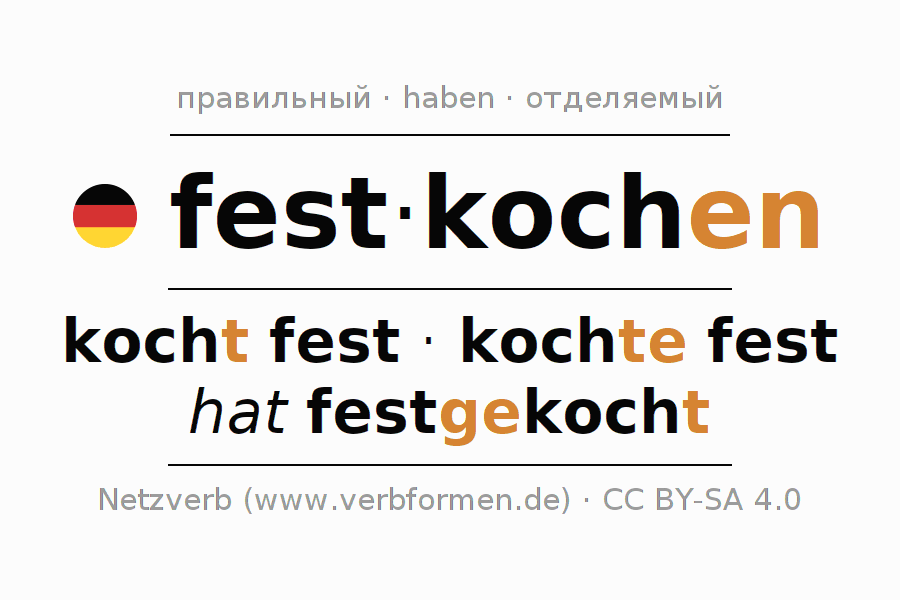 Формами спряжения festkochen (згущать) в повелительном наклонении являются: koche (du) fest, kochen wir fest, kocht (ihr) fest, kochen Sie fest