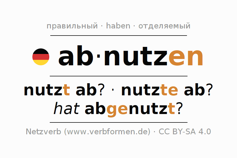 Спряжение abnutzen в Императив Презенс Повелительное наклонение Действительный залог (актив): nutze (du) ab, nutzen wir ab, nutzt (ihr) ab, nutzen Sie ab.Образование этих форм происходит по определённым грамматическим правилам. Так же спрягаются простые глагольные формы abnutzen в Императив. Kомментарии ☆