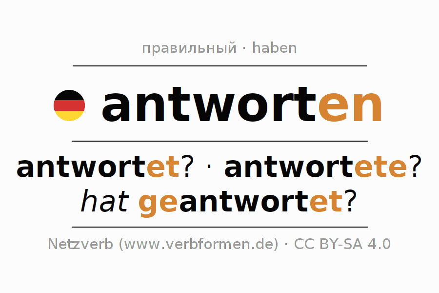 Спряжение antworten в Императив Презенс Повелительное наклонение Действительный залог (актив): antworte (du), antworten wir, antwortet (ihr), antworten Sie.Образование этих форм происходит по определённым грамматическим правилам. Так же спрягаются простые глагольные формы antworten в Императив. Kомментарии ☆