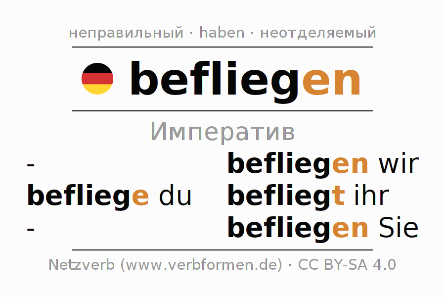 Этот глагол befliegen полностью спрягается во всех лицах и числах Императив Презенс.