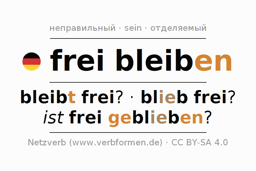 Спряжение freibleiben в Императив Презенс Повелительное наклонение Действительный залог (актив): bleibe (du) frei, bleiben wir frei, bleibt (ihr) frei, bleiben Sie frei.Образование этих форм происходит по определённым грамматическим правилам. Так же спрягаются простые глагольные формы freibleiben в Императив. Kомментарии ☆