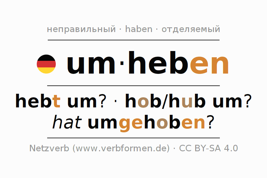 Спряжение umheben в Императив Презенс Повелительное наклонение Действительный залог (актив): hebe (du) um, heben wir um, hebt (ihr) um, heben Sie um.Образование этих форм происходит по определённым грамматическим правилам. Так же спрягаются простые глагольные формы umheben в Императив. Kомментарии ☆