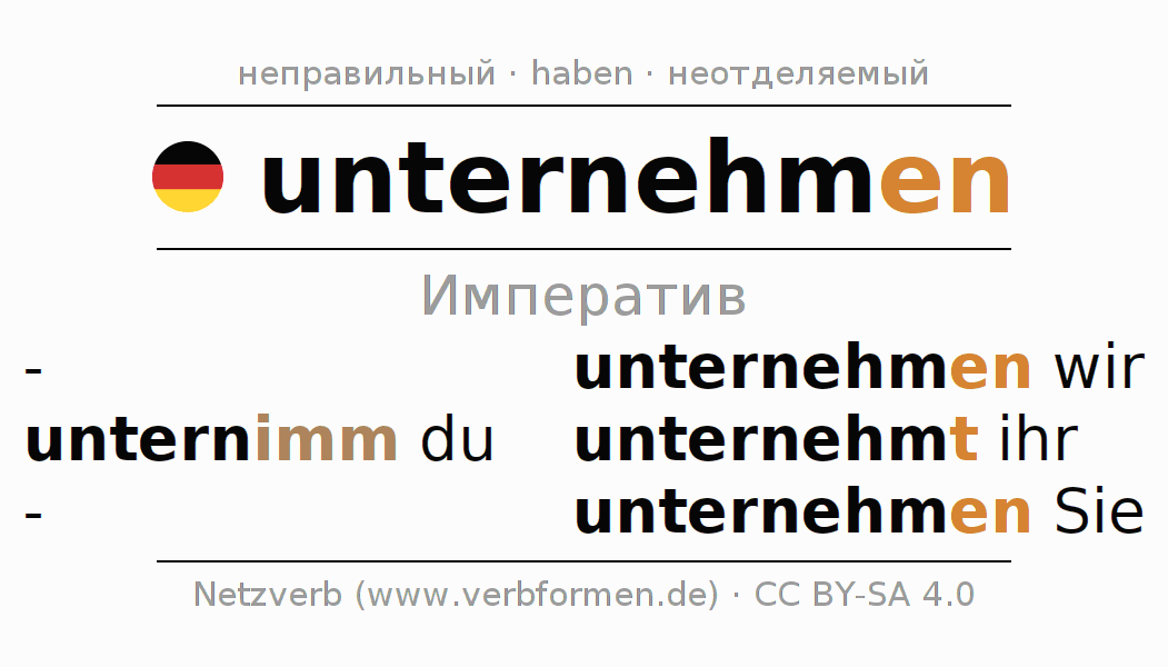 Спряжение unternehmen в Императив Презенс Повелительное наклонение Действительный залог (актив): unternimm (du), unternehmen wir, unternehmt (ihr), unternehmen Sie.Образование этих форм происходит по определённым грамматическим правилам. Так же спрягаются простые глагольные формы unternehmen в Императив. Kомментарии ☆