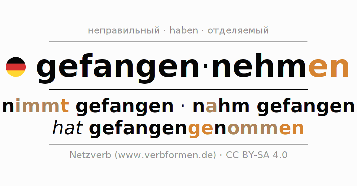 Формами спряжения gefangennehmen (арестовать, задержать) в повелительном наклонении являются: nimm (du) gefangen, nehmen wir gefangen, nehmt (ihr) gefangen, nehmen Sie gefangen