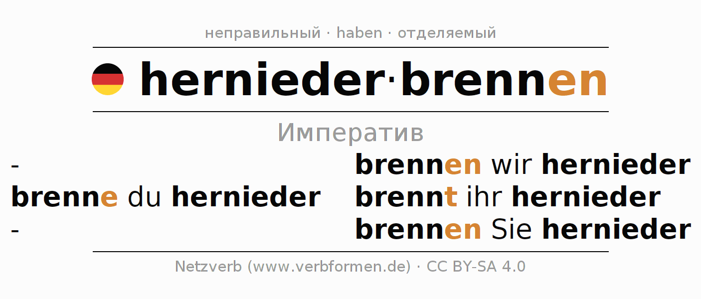 Формами спряжения herniederbrennen (ослепительное свечение, яркий свет) в повелительном наклонении являются: brenne (du) hernieder, brennen wir hernieder, brennt (ihr) hernieder, brennen Sie hernieder