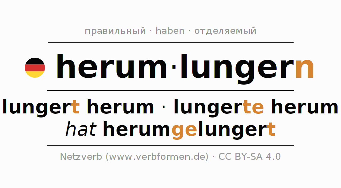 Формами спряжения herumlungern (бездельничать, блуждать) в повелительном наклонении являются: lung(e)re (du) herum, lungern wir herum, lungert (ihr) herum, lungern Sie herum