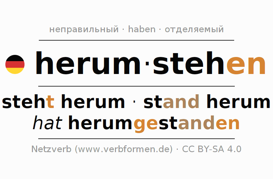 Формами спряжения herumstehen (безделье, бездельничать) в повелительном наклонении являются: stehe (du) herum, stehen wir herum, steht (ihr) herum, stehen Sie herum