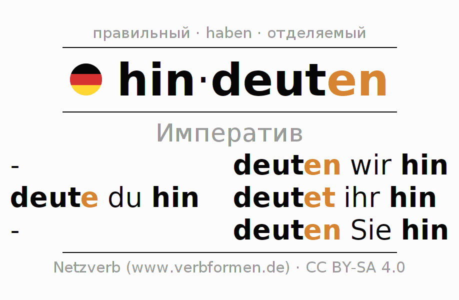 Формами спряжения hindeuten (намекать, указывать) в повелительном наклонении являются: deute (du) hin, deuten wir hin, deutet (ihr) hin, deuten Sie hin
