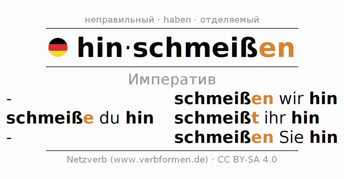 Формами спряжения hinschmeißen (швырять, бросать) в повелительном наклонении являются: schmeiße (du) hin, schmeißen wir hin, schmeißt (ihr) hin, schmeißen Sie hin