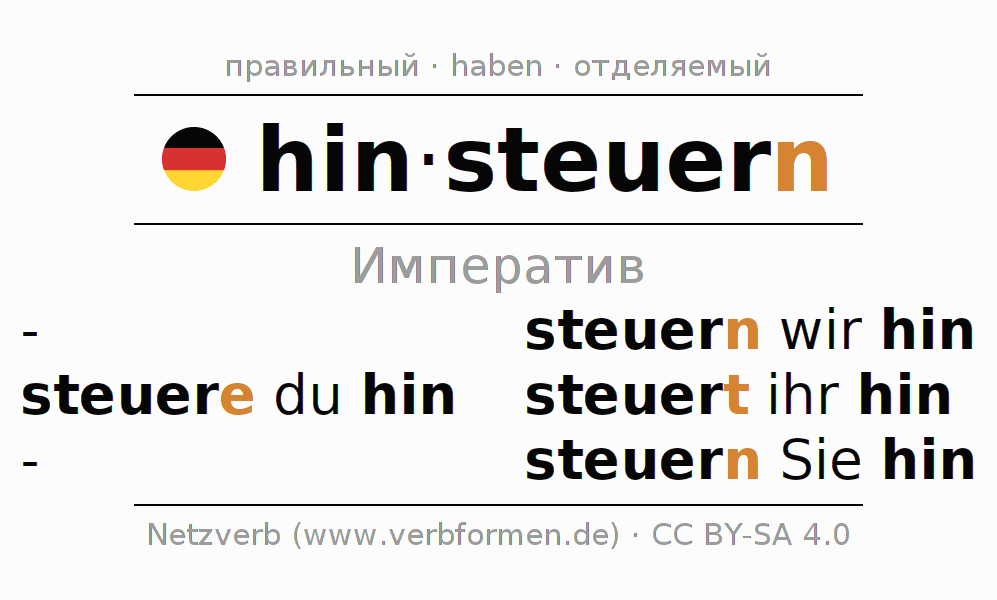 Формами спряжения hinsteuern (направляться, стремиться) в повелительном наклонении являются: steu(e)re (du) hin, steuern wir hin, steuert (ihr) hin, steuern Sie hin