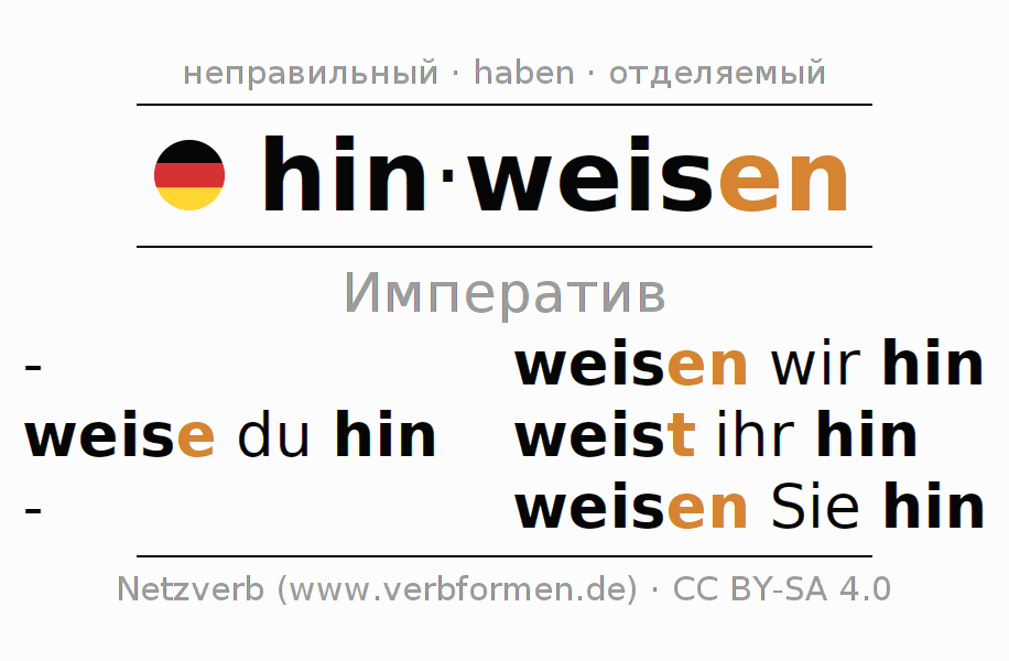 Формами спряжения hinweisen (указывать, ссылаться) в повелительном наклонении являются: weise (du) hin, weisen wir hin, weist (ihr) hin, weisen Sie hin