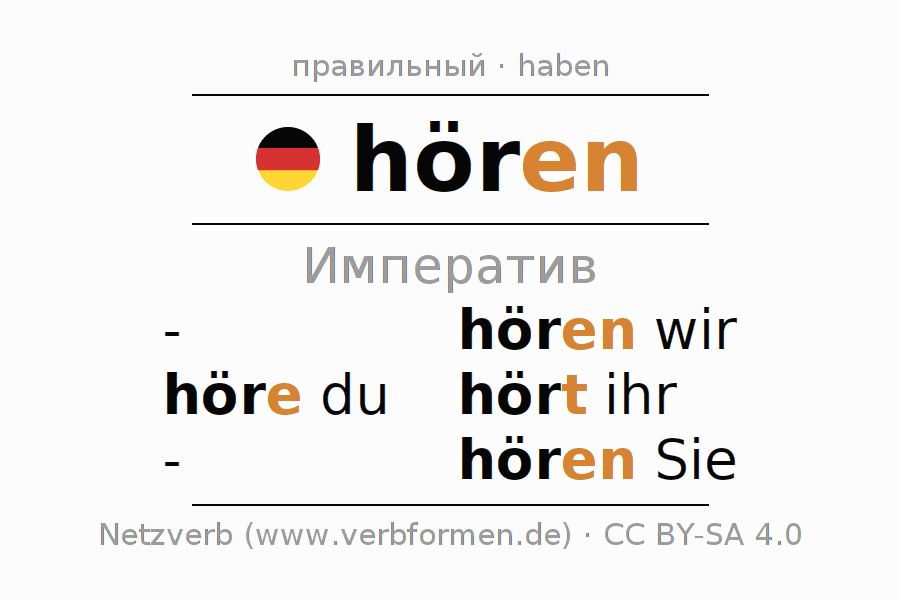 Формами спряжения hören (слушать, слышать) в повелительном наклонении являются: höre (du), hören wir, hört (ihr), hören Sie