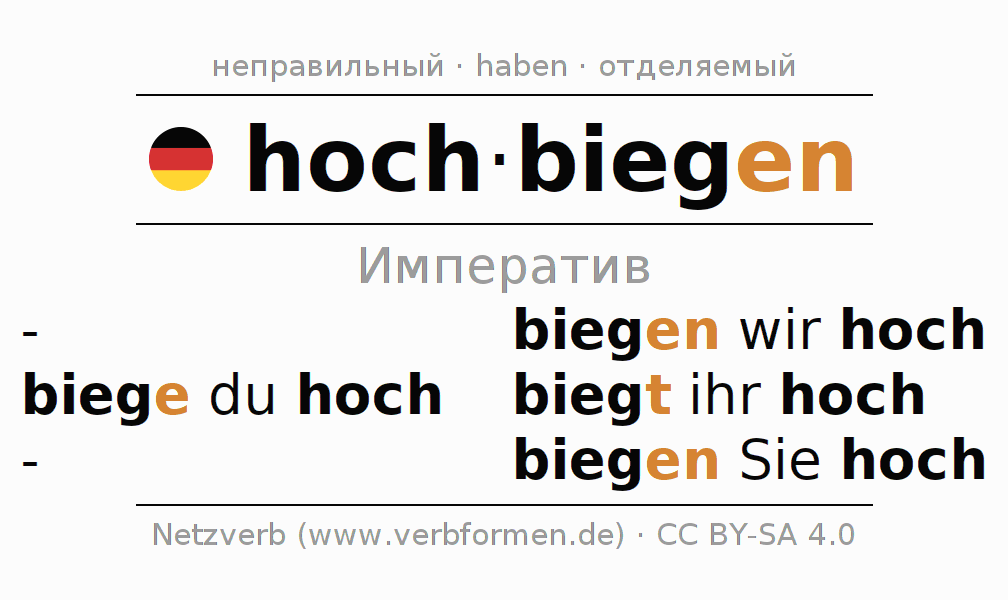 Формами спряжения hochbiegen (выпуклость, загибать вверх) в повелительном наклонении являются: biege (du) hoch, biegen wir hoch, biegt (ihr) hoch, biegen Sie hoch