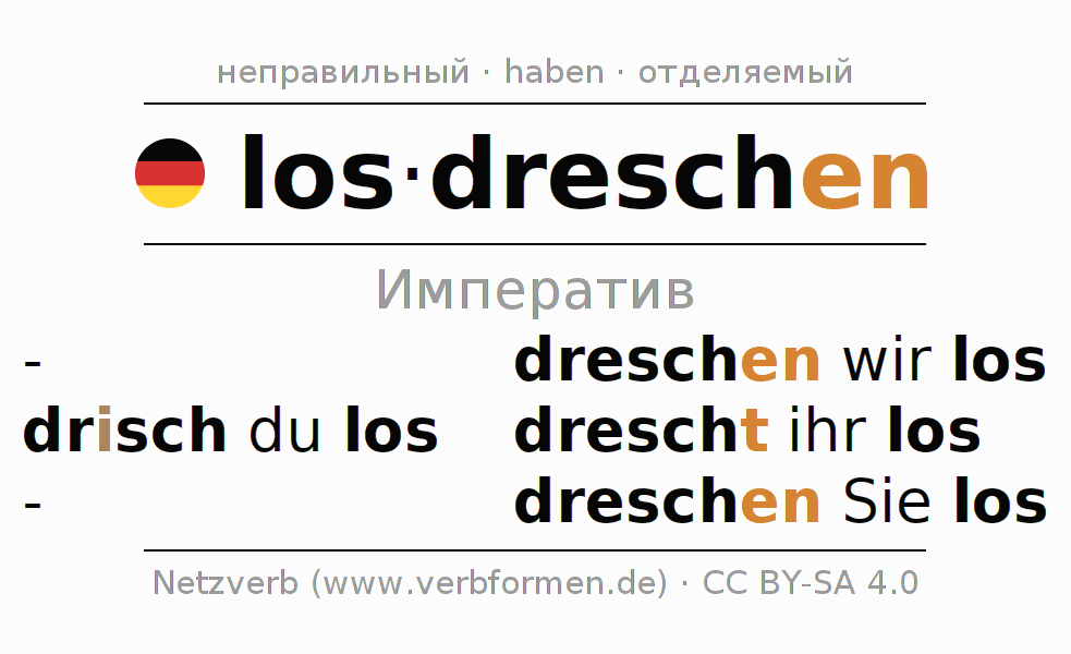 Этот глагол losdreschen полностью спрягается во всех лицах и числах Императив Презенс.