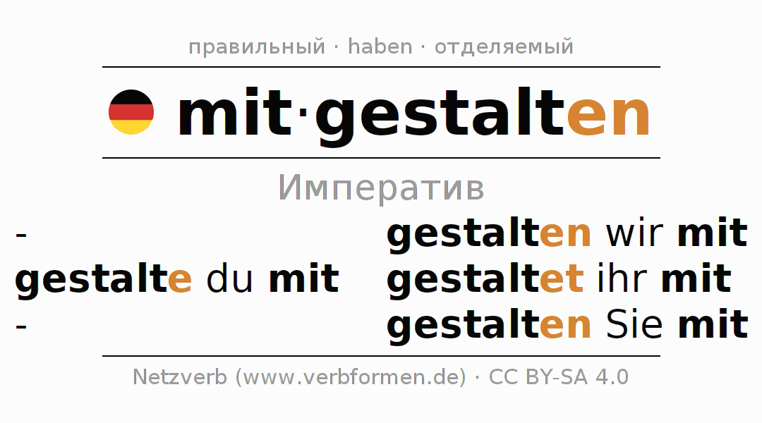 Формами спряжения mitgestalten (совместно оформлять, соучаствовать) в повелительном наклонении являются: gestalte (du) mit, gestalten wir mit, gestaltet (ihr) mit, gestalten Sie mit