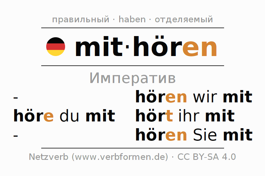 Формами спряжения mithören (подслушивать, слушать) в повелительном наклонении являются: höre (du) mit, hören wir mit, hört (ihr) mit, hören Sie mit
