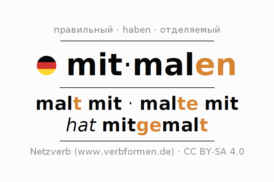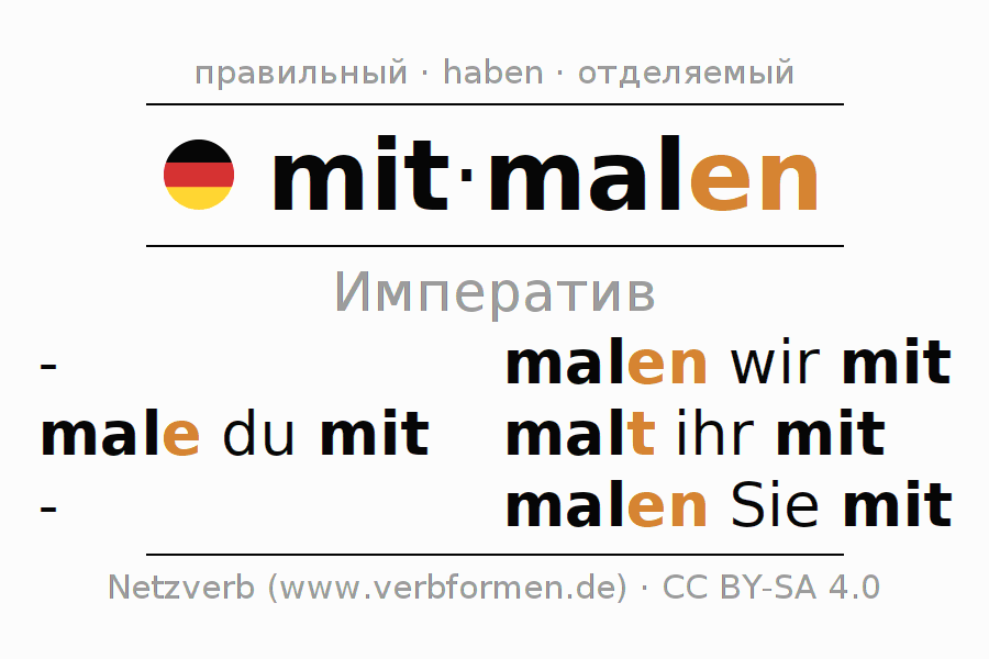 Формами спряжения mitmalen (совместно рисовать) в повелительном наклонении являются: male (du) mit, malen wir mit, malt (ihr) mit, malen Sie mit