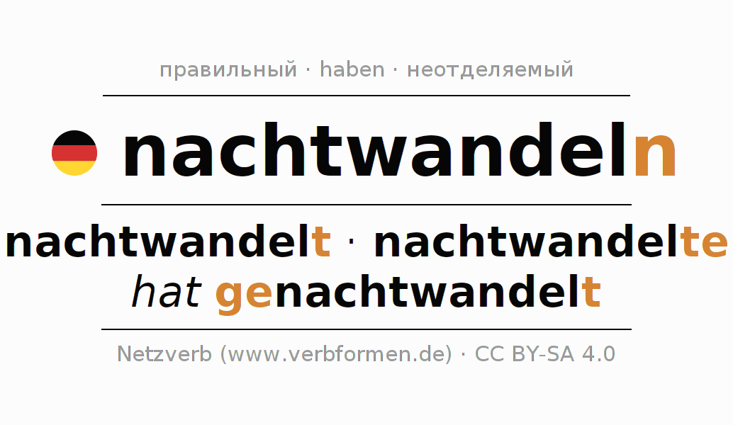 Формами спряжения nachtwandeln (лунатизм, блуждание во сне) в повелительном наклонении являются: nachtwand(e)le (du), nachtwandeln wir, nachtwandelt (ihr), nachtwandeln Sie