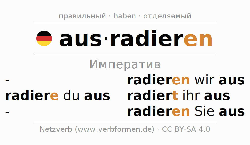 Этот глагол ausradieren полностью спрягается во всех лицах и числах Императив Презенс.