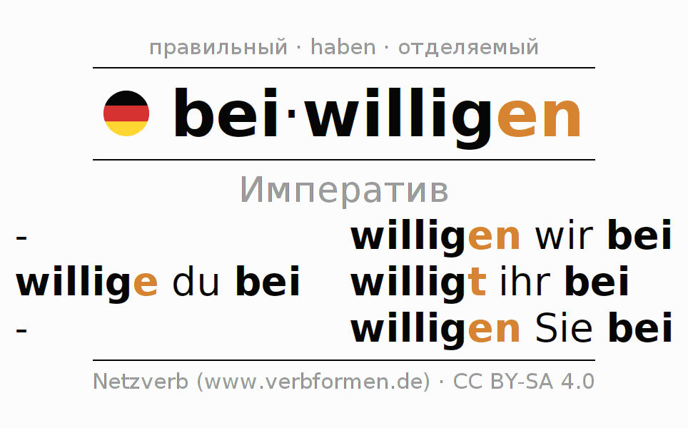 Спряжение beiwilligen в Императив Презенс Повелительное наклонение Действительный залог (актив): willige (du) bei, willigen wir bei, willigt (ihr) bei, willigen Sie bei.Образование этих форм происходит по определённым грамматическим правилам. Так же спрягаются простые глагольные формы beiwilligen в Императив. Kомментарии ☆