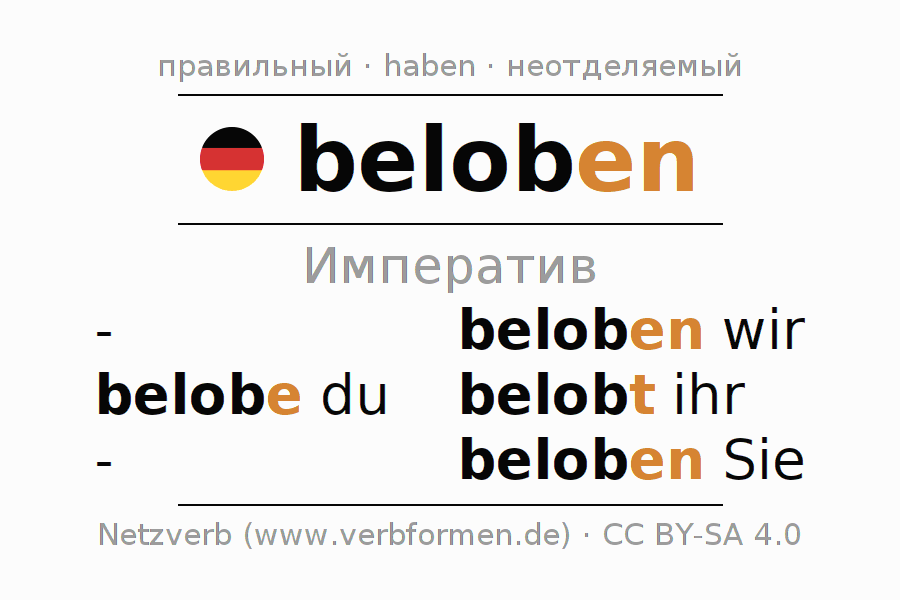 Спряжение beloben в Императив Презенс Повелительное наклонение Действительный залог (актив): belobe (du), beloben wir, belobt (ihr), beloben Sie.Образование этих форм происходит по определённым грамматическим правилам. Так же спрягаются простые глагольные формы beloben в Императив. Kомментарии ☆