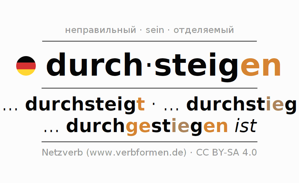 Спряжение durchsteigen в Императив Презенс Повелительное наклонение Действительный залог (актив): steige (du) durch, steigen wir durch, steigt (ihr) durch, steigen Sie durch.Образование этих форм происходит по определённым грамматическим правилам. Так же спрягаются простые глагольные формы durchsteigen в Императив. Kомментарии ☆