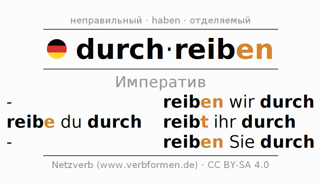 Спряжение durchreiben в Императив Презенс Повелительное наклонение Действительный залог (актив): reibe (du) durch, reiben wir durch, reibt (ihr) durch, reiben Sie durch.Образование этих форм происходит по определённым грамматическим правилам. Так же спрягаются простые глагольные формы durchreiben в Императив. Kомментарии ☆