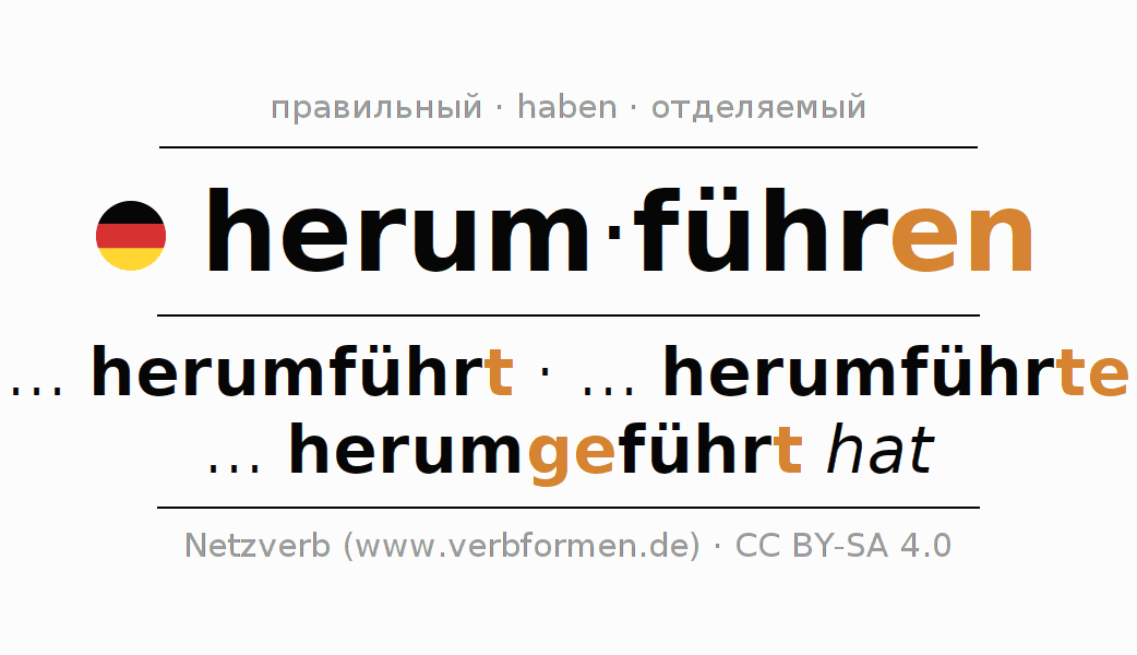 Спряжение herumführen в Императив Презенс Повелительное наклонение Действительный залог (актив): führe (du) herum, führen wir herum, führt (ihr) herum, führen Sie herum.Образование этих форм происходит по определённым грамматическим правилам. Так же спрягаются простые глагольные формы herumführen в Императив. Kомментарии ☆