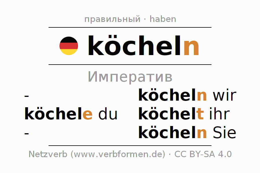 Спряжение köcheln в Императив Презенс Повелительное наклонение Действительный залог (актив): köch(e)le (du), köcheln wir, köchelt (ihr), köcheln Sie.Образование этих форм происходит по определённым грамматическим правилам. Так же спрягаются простые глагольные формы köcheln в Императив. Kомментарии ☆