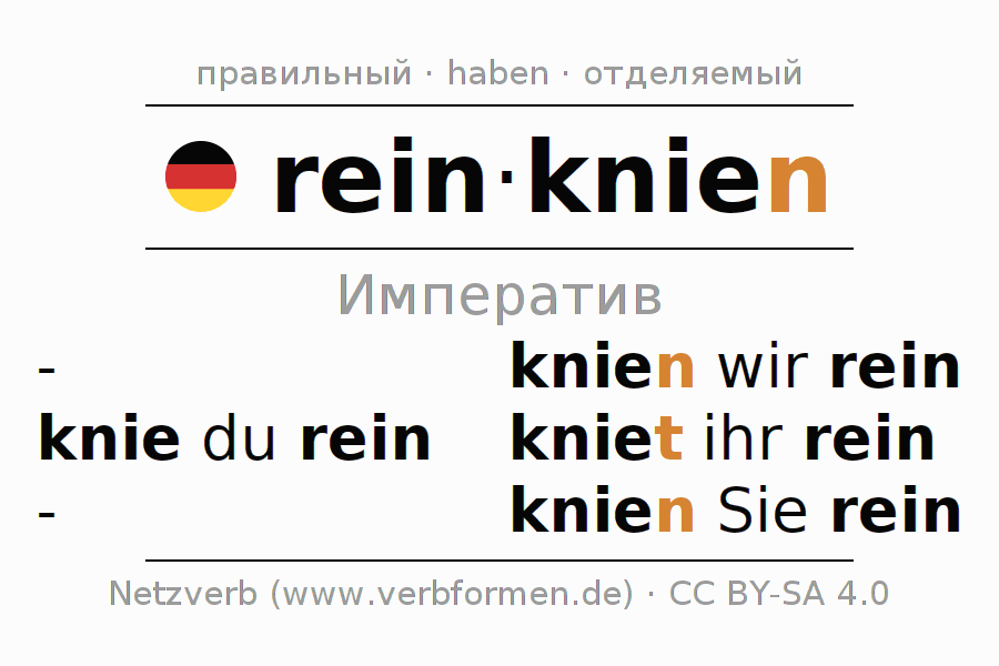 Спряжение reinknien в Императив Презенс Повелительное наклонение Действительный залог (актив): knie (du) rein, knien wir rein, kniet (ihr) rein, knien Sie rein.Образование этих форм происходит по определённым грамматическим правилам. Так же спрягаются простые глагольные формы reinknien в Императив. Kомментарии ☆