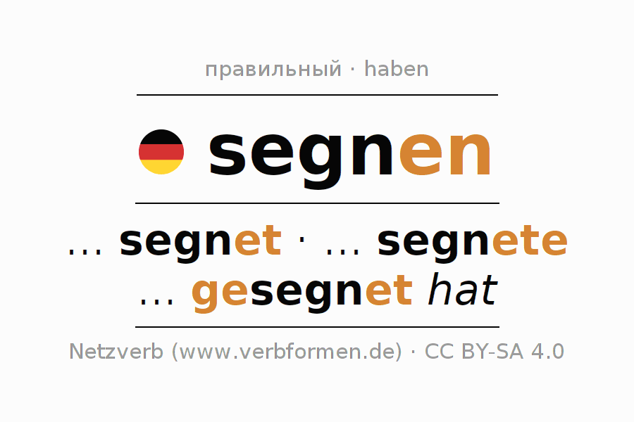 Спряжение segnen в Императив Презенс Повелительное наклонение Действительный залог (актив): segne (du), segnen wir, segnet (ihr), segnen Sie.Образование этих форм происходит по определённым грамматическим правилам. Так же спрягаются простые глагольные формы segnen в Императив. Kомментарии ☆