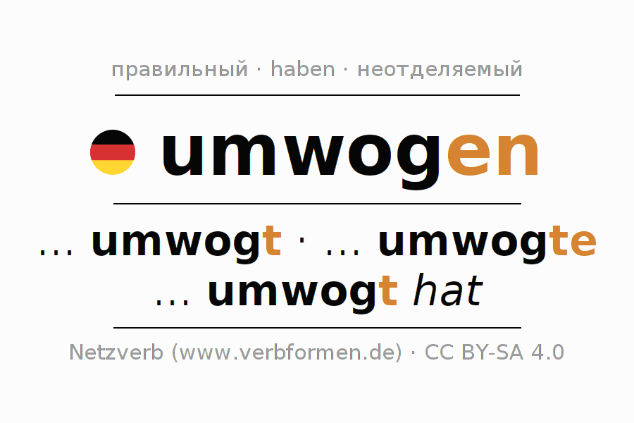 Спряжение umwogen в Императив Презенс Повелительное наклонение Действительный залог (актив): umwoge (du), umwogen wir, umwogt (ihr), umwogen Sie.Образование этих форм происходит по определённым грамматическим правилам. Так же спрягаются простые глагольные формы umwogen в Императив. Kомментарии ☆