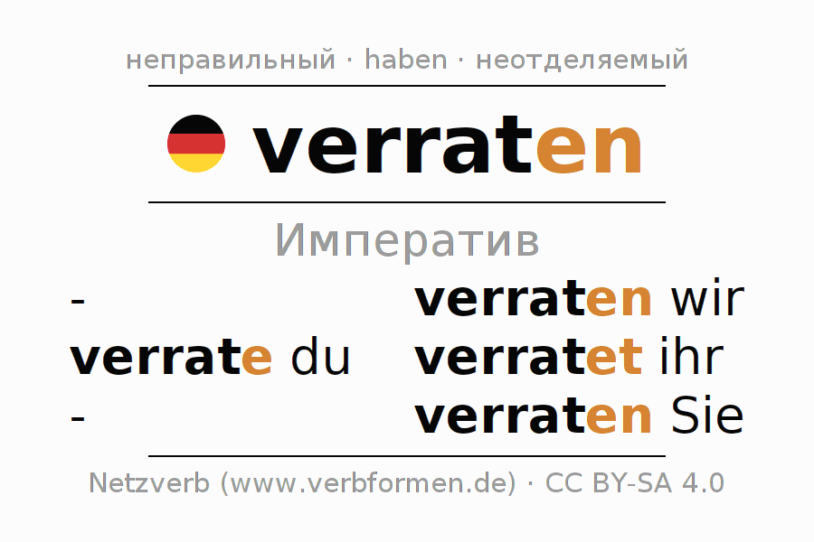 Спряжение verraten в Императив Презенс Повелительное наклонение Действительный залог (актив): verrate (du), verraten wir, verratet (ihr), verraten Sie.Образование этих форм происходит по определённым грамматическим правилам. Так же спрягаются простые глагольные формы verraten в Императив. Kомментарии ☆
