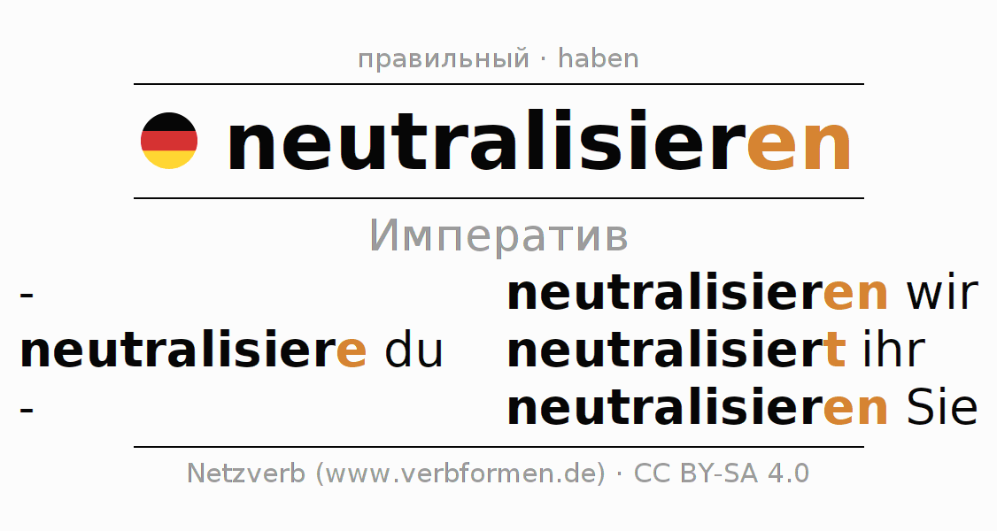 Формами спряжения neutralisieren (нейтрализовать, обезвредить) в повелительном наклонении являются: neutralisiere (du), neutralisieren wir, neutralisiert (ihr), neutralisieren Sie