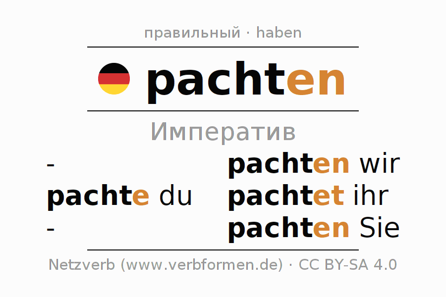 Формами спряжения pachten (арендовать, брать в аренду) в повелительном наклонении являются: pachte (du), pachten wir, pachtet (ihr), pachten Sie
