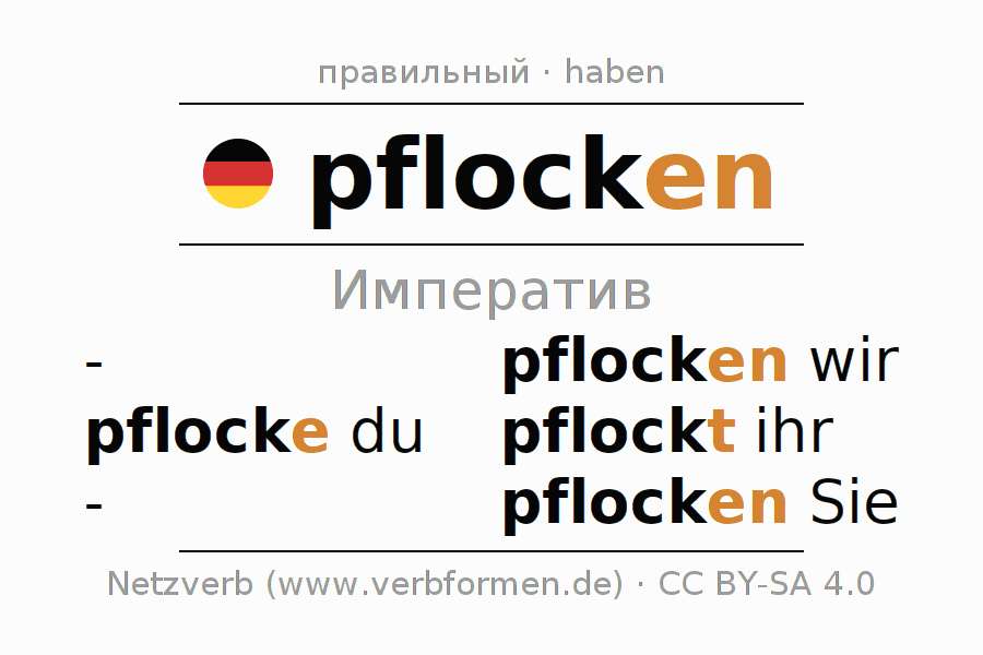 Формами спряжения pflocken (закрепить) в повелительном наклонении являются: pflocke (du), pflocken wir, pflockt (ihr), pflocken Sie