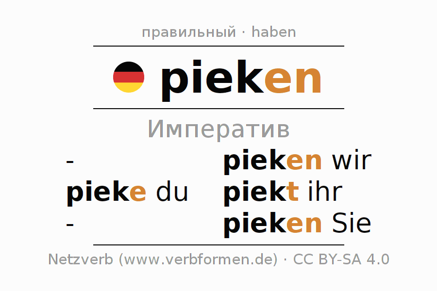 Формами спряжения pieken (колоть, укалывать) в повелительном наклонении являются: pieke (du), pieken wir, piekt (ihr), pieken Sie